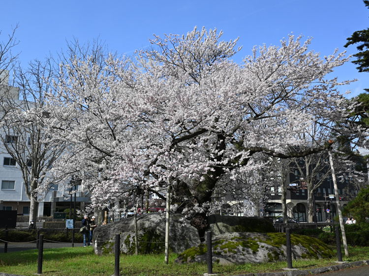 盛岡市の盛岡地方裁判所の前にある一本桜。大きな花崗岩の裂目に根付いた桜が、成長と共に石を割ながら大きくなった生命力に圧倒される。見ていると、不可能なことは無い様にも感じる桜だ。以前は五月始めに花を付けていたが、最近は4月後半に満開を迎える。国指定天然記念物。