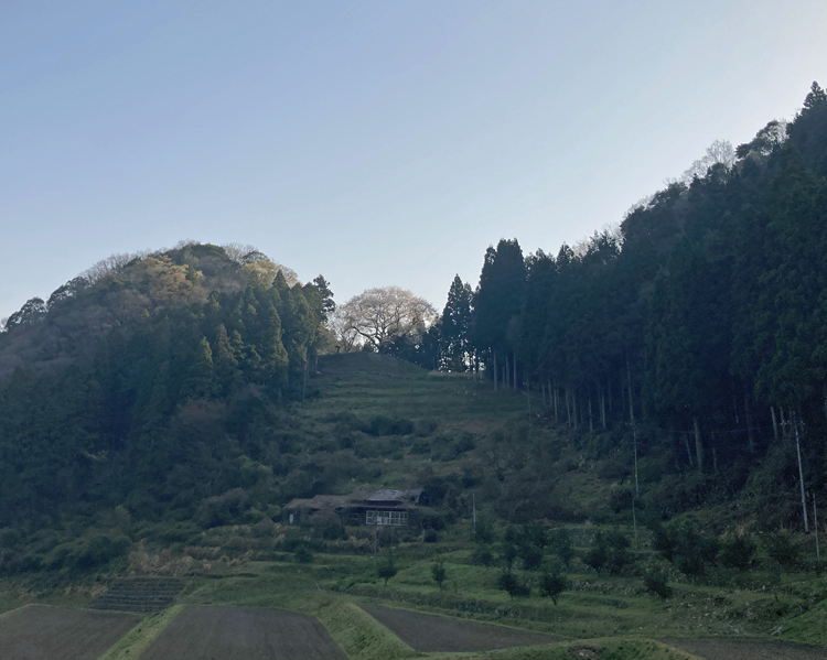 益田市から東の山間に入った美都町の、見晴らしの良い高台に植わっている江戸彼岸の大桜。入船山城を築いた澄川氏が、金谷地に移り住んだ時、城の出丸に植えたものと伝わっている。樹高は15mで、幹回りは7m。地上2ⅿ付近で大きく3本に枝分かれし、東西19m・南北25ⅿに枝を広げている。高台にある事から、遠くからも良く見える。城山桜と呼ばれているが、樹種は江戸彼岸桜である。島根の桜というと三隅の大桜を思い浮かべるが、決して負けていない。